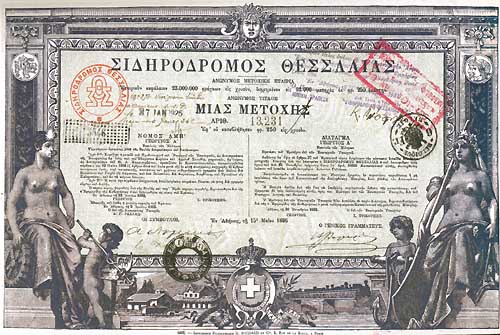 Το μήκος της γραμμής Βόλος-Λάρισα θα ήταν 60 χιλιόμετρα, και της γραμμής Βελεστίνο-Καλαμπάκα 142 χιλιόμετρα. Η διάρκεια του προνομίου της εκμετάλλευσης ανερχόταν σε 99 χρόνια, με δικαίωμα του Κράτους να το εξαγοράσει ύστερα από την παρέλευση μιας δεκαπενταετίας (15). Η αρχική επωνυμία της επιχείρησης είταν «Σιδηρόδρομος της Θεσσαλίας Ανώνυμος Μετοχική Εταιρία» και ιδρύθηκε τον Οκτώβριο του 1882, με την εκχώρηση, από τον Τραπεζικό Οίκο FILS Α. MAVROCORDATO της Κωνσταντινούπολης, των προνομίων της σύμβασης, αντί του ποσού των 22.500.000 γαλλικών φράγκων. Το μετοχικό κεφάλαιο της νέας Εταιρίας αποτελούνταν από 92.000 μετοχές των 250 δρχ. η κάθε μία. Η διάθεσή τους σε δημόσια εγγραφή απέτυχε – 8.348 μόνο διατέθηκαν – γιαυτό και τις ανέλαβαν πάλι οι μετέχουσες στην κατασκευή Εταιρίες (16), με επικεφαλής τις τράπεζες του Μαυροκορδάτου στην Κωνσταντινούπολη.